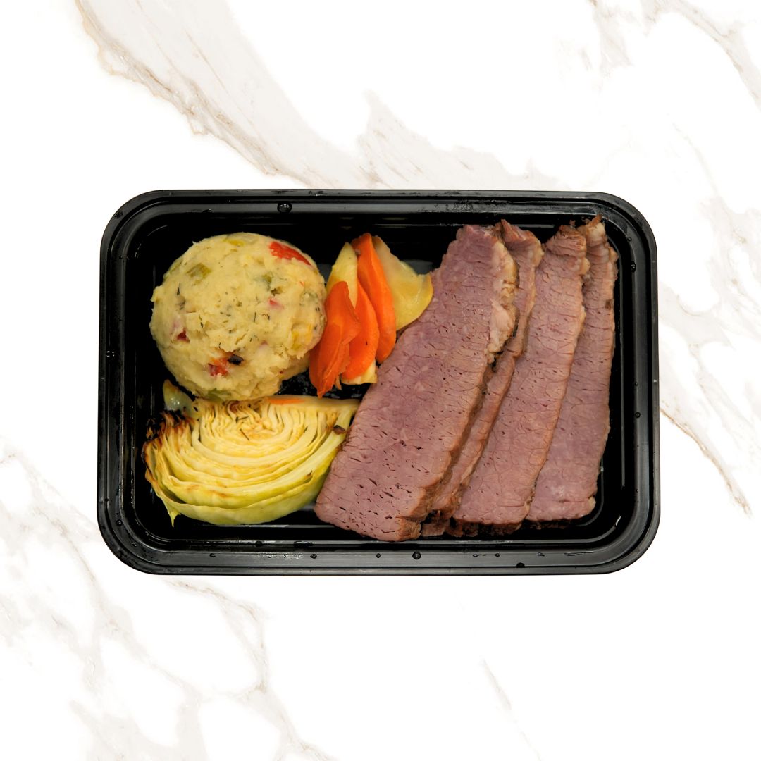 We cure and marinate the beef for 5 days, then cook it low and slow to come out tender and delicious! Served with cabbage and mashed potatoes.