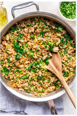 Lean ground turkey sautéed with garlic and extra virgin olive oil, served over fluffy rice with a side of homemade tangy sauerkraut and seasoned vegetables.